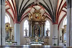 Die spätgotische, dreischiffige Hallenkirche hat im Mittelschiff ein Sternrippengewölbe und in den Seitenschiffen Kreuzrippengewölbe. Die an sich kleine Kirche mit lediglich einem zweijochigen Langhaus hat eine innere Länge von 25,4 Meter und eine innere Breite von 16,8 Meter und ist vergleichsweise niedrig. Der mit dem Mittelschiff gleich breite einjochige Chor schließt mit einem Vierzehntelschluss. Der netz- und sternrippengewölbte Chorumgang hat die gleiche Breite wie die Seitenschiffe. Während es sich beim Pfeilerpaar des Chores um Rundpfeiler handelt, sind die des Schiffes kreuzförmig mit abgefasten Vorlagen an allen vier Seiten. In der südlichen Portalvorhalle führt ein bemerkenswertes spätgotisches Portal in die Kirche, dessen Gewände durch das später erbaute Gewölbe überschnitten wird. Die Halle enthält mehrere Fragmente von Grabdenkmälern aus Rotmarmor.