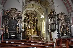 Der Hochaltar und die Seitenaltäre im Stil des Rokoko in der Art des Jakob Peyer wurden 1765 konsekriert und 1893 neu vergoldet.