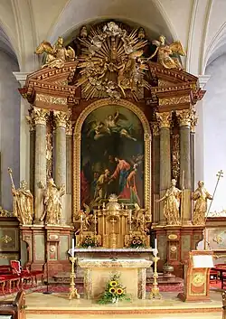 Der 1785 geweihte Hochaltar ist ein monumentales frühklassizistisches Doppelsäulenretabel nach einem Entwurf des Architekten Andreas Zach und der Ausführung des Bildhauers Simon Reindl mit den Statuen Augustinus, Andreas, Jakobus und Karl Borromäus, mit einem Strahlenkranz mit Engeln im Sprenggiebelbereich und dem Tempietto-Tabernakel mit eucharistischen Szenen als Relief im Sockelbereich. Das Altarblatt Schlüsselübergabe an den hl. Petrus malte Carl Frister (1783). Der linke spätbarocke Seitenaltar als Säulenretabel mit Volutenauszug aus 1764 trägt die Statuen Judas Thaddäus und Johannes Evangelist und zeigt das Altarblatt Tod der hl. Anna und das Oberbild hl. Barbara, beide von Martin Johann Schmidt (1763). Der rechte Seitenaltar in gleicher Bauart aus 1762/1763 trägt die Statuen Ferdinand und Leopold und zeigt das Altarblatt Tod des hl. Josef und das Oberbild hl. Katharina, beide von Franz Xaver Wagenschön.