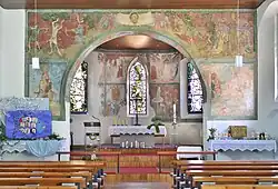Rund 115 Jahre später wurden die alten Fresken im Altarraum wiederentdeckt, freigelegt und 1889/90 vom Maler Josef Reich aus Bizau renoviert. Sie zeigen Szenen aus dem Leben Mariens und zwölf Apostelgestalten mit deutschen Inschriften. Die Fresken an der Chorbogenwand blieben jedoch bis in die 1960er Jahre verdeckt. Im Zuge eines Umbaus, bei dem die Barockaltäre und die Barockkanzel entfernt wurden, renovierte Hans Bertele aus Schruns die Chorbogenfresken. Die Fresken auf dem Chorbogen zeigen beginnend von links oben das Martyrium des heiligen Sebastian, das Schweißtuch der Veronika, Sankt Martin zu Pferd mit dem Bettler zu Füßen und die Schutzmantelmadonna. Unten links ist Anna selbdritt abgebildet, die Szene unten rechts kann nicht klar zugeordnet werden. Zur Ausstattung der Kirche gehört auch ein spätromanisches Prozessions-Vortragekreuz, das um 1300 geschaffen wurde. Im Inneren der Querbalken des ausgehöhlten Kreuzes sind sieben Reliquien verwahrt. Das kostbare Kreuz wird im Pfarrarchiv aufbewahrt.