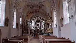 Den Hochaltar schuf Urban Mayr 1769/1774 als luftige Säulenarchitektur mit Opfergangsbögen, er trägt die Statuen Madonna, Bischof Valentin, Priester Valentin, Sebastian, Christophorus, alle von Johann Reindl 1769, wohl gefasst vom Faßmaler Andreas Schnaitter 1774.