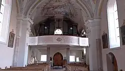 Die Deckenmalereien schuf Josef Anton Puellacher um 1765, im Chor Verehrung der Hostie mit den Heiligen Valentin und Leonhard, an der Chorwand büßende hl. Maria Magdalena und Stigmatisation des hl. Franziskus, im Langhaus hl. Valentin heilt Kranke, Madonna mit den Heiligen Barbara, Sebastian, Christophorus und Priester. Über der Empore hl. Cäcilia schuf Josef Prantl 1957.