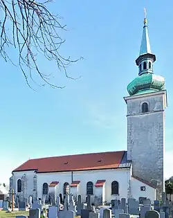 Außen an der Friedhofsmauer vorgelagert steht eine große Friedhofskapelle mit seitlichen Pilastern, einem geschwungenen Giebel und Flammenvasenaufsätzen. Die Kapelle wurde in der ersten Hälfte des 18. Jahrhunderts erbaut und wurde 1952/1954 restauriert und im Gedenken an die Opfer der Weltkriege adaptiert.