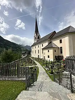 Die große spätbarocke Kirche besteht aus einem Saalraum und einem zu dessen Achse geknickten, dreiseitig geschlossenen Chor. An Langhaus und Chor befinden sich über den hohen rechteckigen Fenstern kleine Korbbogenfenster, ein Halbgeschoß andeutend. Die dreigeschoßige Westfassade mit je einer Fensterachse zu beiden Seiten des Turmes wird durch einen Wellgiebel und Riesenpilaster gestaltet. Die beiden Gedenktafeln ehren Bischof Kahn und den 1945 von den Nationalsozialisten hingerichteten Priester Anton Granig. Der fünfgeschoßige, gotische Eingangsturm besitzt spitzbogige Schallfenster und wird von einem Spitzgiebelhelm bekrönt. Ein Spitzbogenportal führt in die Eingangshalle im Turmerdgeschoß mit einem Netzrippengewölbe über vier Eckpfeilern. Die Wandmalereien in der Vorhalle sind ein Zeugnis des im 16. Jahrhundert protestantischen Mölltals. Die Auswahl der Bibelverse auf den Spruchbänder der Evangelisten im Gewölbe betont den allein selig machenden Glauben an Christus. An der nördlichen Schildwand sind die Kreuzigung, die Auferstehung und die Himmelfahrt dargestellt, flankiert vom rechten Schächter, dem Paulussturz, der Fußsalbung durch Maria Magdalena und der Berufung des Zachäus. Die Malereien entstanden zwischen 1580 und 1600 und waren wohl von der Familie Putz, den Besitzern des Schlosses Großkirchheim in Auftrag gegeben worden. Die Tiara im Gewölbe wurde später hinzugefügt.