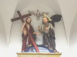 Eine vermutlich um 1888 von einem Tischler aus Altreiteregg geschnitzte Dreifaltigkeitsgruppe befand sich bis 1950 an der westlichen Langhauswand. Sie steht mittlerweile auf einem Schrank im Verbindungsgang zwischen der Sakristei und dem Nebenraum. Die mit farbigen Glasornamenten gestalteten Scheiben der zehn Fenster im Langhaus wurden, wie auch jene der Chorfenster, 1865 von Glaswerkstätten in München und Zürich geliefert.[6][22]