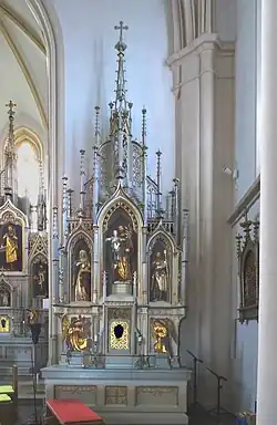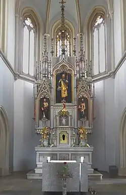Das Altarretabel des neugotischen Hochaltars wurde 1867 von dem Grazer Tischler Josef Kainz nach einem Entwurf des Architekten Härtl geschaffen und aufgestellt. Die Figuren fertigte Jakob Gschiel. Der Mittelteil des Altars ist gegenüber den beiden Seitenteilen hervorgehoben. Die vier Nischen sind mit floralen Verzierungen geschmückt. Über dem Mittelteil und den beiden Seitenteilen erhebt sich jeweils ein Zierturm mit durchbrochenen Elementen und Fialen. Den mittleren Zierturm bekrönt ein vergoldetes Kreuz. In der Hauptnische steht eine Figur des Apostels Bartholomäus, der in einer Hand eine Schriftrolle und in der anderen als Zeichen seines Martyriums ein Schindermesser hält. Er wird von Figuren der Apostel Petrus, der ein Evangelium und einen Schlüssel hält, und Paulus mit Evangelium und Schwert in den Nischen der Seitenteile flankiert. In den Fuß des Retabels ist das mit einer vergoldeten Tür mit einer Kruzifixdarstellung verschließbare Tabernakel eingelassen. Links und rechts vom Tabernakel kniet je eine Engelsfigur. Über dem Tabernakel befindet sich das Expositorium, die Nische zur Aussetzung des Allerheiligsten bei der eucharistischen Anbetung, in der wechselnd eine plastische Darstellung des Auges der Vorsehung oder eine Figur des Jesuskinds aufgestellt ist.[19]