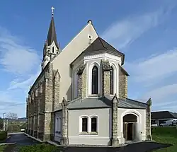 Das neugotische Gebäude ist eine einschiffige Saalkirche mit einem hohen Kirchturm. Es ist nach Südwesten ausgerichtet und hat zwei an den Chor angebaute Räume, von denen der nördliche als Sakristei genutzt wird. Im Nordosten ist der Kirchturm als Fassadenturm in die Giebelfassade des Kirchenschiffes eingestellt.[7]