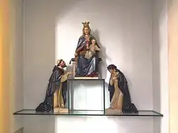 In der nördlichen Wandnische unter der Empore wurde im Herbst 1915 der Rosenkranzaltar aufgestellt. Die Figuren auf diesem Altar stammen ebenfalls von Jakob Gschiel und stehen auf Glasplatten. Eine Rosenkranzmadonna mit Jesuskind ist die Hauptfigur und wird von knienden Figuren des heiligen Dominikus und der heiligen Klara flankiert. Eine Pietà und ein sitzender Schmerzensmann wurden 1888 aufgestellt und flankieren das Nordportal des Langhauses. An den Wänden des Langhauses hängen 14 von Gschiel in Gussmasse gefertigte und 1873 geweihte Kreuzwegstationen. Das marmorne Taufbecken aus dem Jahr 1884 steht vor dem Rosenkranzaltar, beim nördlichen Doppelfenster unterhalb der Empore. Es hatte ursprünglich auch einen hölzernen Aufsatz mit gotischen Türmchen. Der neuzeitliche Aufsatz ist aus Metall und wird von einem Kreuz bekrönt. An einem der Emporenpfeiler steht auf einem Sockel eine Figur des heiligen Antonius von Padua mit dem Jesuskind auf dem Arm. In der südlichen Wandnische unter der Empore steht ein hölzerner Beichtstuhl aus dem Jahr 1867/68. Neben der Tür zum Emporenaufgang hängt eine Tafel mit Bildern der im Zweiten Weltkrieg gefallenen Pfarrbewohner. Zwei Figuren, die Jesus und Maria mit Lilie darstellen, rahmen die Orgel. Das Kirchengestühl wurde vermutlich 1867 von Josef Kainz geliefert.[21][22]