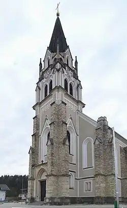 Da die zur Pfarre gehörenden Gemeinden selbst die Bauleitung übernehmen mussten, wurde im Jänner 1863 ein Kirchenbaukomitee gewählt. Der erste Spatenstich erfolgte am 30. Juni 1863; Baubeginn war erst im Frühjahr 1864. Die Kirche war die erste in der Steiermark, die vollständig in einem neugotischen Baustil errichtet wurde.[5] Vinzenz Knödl und der Seckauer Fürstbischof Ottokar Maria von Attems feierten am 4. Mai 1864 die Grundsteinlegung beim heutigen Frauenaltar. Die Mauerarbeiten führten der Grazer Baumeister Carl Eichinger[6] oder Schaumburg[7] aus. Das Kirchenschiff sowie der Kirchturm waren im Spätsommer 1865 fertig überdacht. Am 14. September desselben Jahres wurde das Turmkreuz gesegnet und aufgesetzt. Hochaltar und Kanzel kamen im Herbst 1867. Zur gleichen Zeit wurden die Turmuhr eingebaut und fünf Glocken im Kirchturm aufgehängt.[6][8]