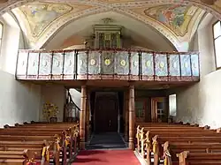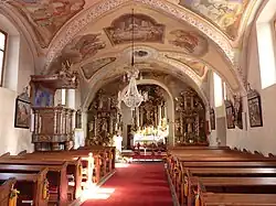 Das vierjochige Langhaus wird durch einen stark eingeschnürten, rundbogigen Fronbogen vom gleich breiten, einjochigen Chor getrennt. Der Chor, der noch aus dem Mittelalter stammt, hat spätromanische Fenster und einen geraden Schluss. Sowohl das Langhaus als auch der Chor werden von einem Stichkappentonnengewölbe überspannt. An den Chor ist die niedrigere und schmälere Sakristei angebaut. Die laut einer Inschrift 1864 renovierte Empore aus Holz befindet sich im westlichen Teil des Langhauses. Sie sitzt auf vier Säulen und hat einen vorschwingenden Mittelteil.[2]
