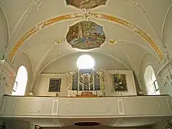 Das Kircheninnere zeigt zwei Vorjoche unter einer Stichkappentonne mit flachen Gurtbögen. Der querschiffartig erweiterte Mittelraum ist mit einer ovalen Pendentif-Flachkuppel überwölbt, deren dominierender Charakter durch die Malerei einer gewaltigen Himmelsszenerie noch verstärkt wird. Der Chor mit einer Wandgliederung mit Schichtpilastern schließt mit einem Dreiseitschluss. Im ersten Chorjoch sind Portale mit geohrter Stuckrahmung zum Turm und zur Sakristei, links darüber gibt es ein Oratorium mit einem Zugang zur Kanzel auf Volutenkonsolen mit von Rocaillen und Vasen bekrönendem Gitter, darüber zeigt sich ein gemaltes Scheinfenster, rechts zeigt sich eine Blindfensternische.