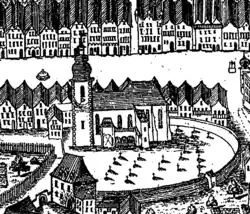 Der ältesten Hinweis auf eine frühere Kirche ist die unter dem Chor gelegene Krypta, die von einem steinernen Bau aus dem 11. oder 12. Jahrhundert stammt. Diese romanische Kirche war vermutlich eine dreischiffige Basilika. Beim Marktbrand 1554 wurde die Kirche schwer beschädigt und unter Beibehaltung der Mauern des Langhauses und des spätgotischen Presbyteriums als dreischiffige Hallenkirche wieder aufgebaut. 1681 wurde der Chor in barocken Formen neu gebaut, wobei die alten gotischen Strebepfeiler übernommen wurden. Der Turm wurde bei einem Brand 1814 zerstört und 1829 in neuer Form wieder aufgebaut.