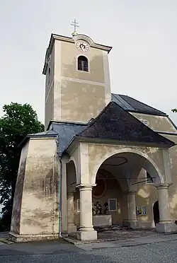 Der im Kern gotische Kirchturm befindet sich nördlich des Westjoches und hat ein flaches Zeltdach. Er wurde 1779 erhöht und 1842 wieder verkürzt. An seiner Nordseite befinden sich zwei Stützpfeiler. Westlich des Turmes befindet sich ein auf Rundpfeilern errichteter, offener Kapellenbau. In ihm befindet sich ein barockes Ovalfresko aus der ersten Hälfte des 18. Jahrhunderts, welches die heilige Anna zeigt. An der Außenseite des Chores und an der südlichen Langhausseite befinden sich Strebepfeiler. Im Westen befindet sich das spitzbogige Eingangsportal. Südlich des Portals befindet sich eine mit 1610 datierte Außenkanzel mit einem Wappen, vermutlich jenes der Baumber.[2]