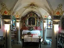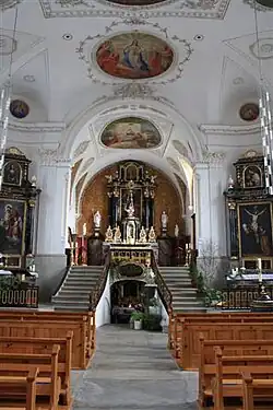 Eine Halbkreistonne, in die spitzbogige Stichkappen schneiden, überwölbt den Chorraum, das Deckenbild stellt das heilige Abendmahl dar. Die Ansätze des Gewölbes ruhen auf Konsolen mit Eierstab. Die Retabel des Hochaltars besteht aus schwarzgrauem Stuckmarmor und besitzt die Form einer Ädikula mit doppelter Säule, die von lebensgrossen Figuren der Heiligen Benedikt und Bernhard flankiert wird. Auf dem Hauptblatt sind die Muttergottes und der Apostelfürst zu sehen, auf dem Oberblatt der Heilige Burkard. An der Nordseite führt ein Zugang ins Innere des Kirchturms, in dem sich auch die Sakristei befindet.[11]