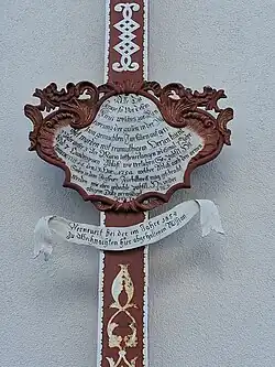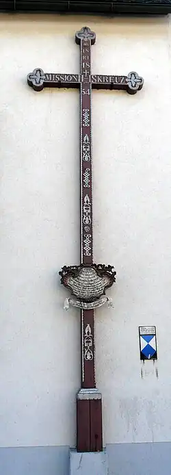 Anlässlich der Volksmission zur 100-jährigen Wiederkehr des Erlasses des Quadragenen Ablasses wurde in 1854 das Kreuz errichtet. Die Tafel erinnert an den Quadragenen Ablass, den der Papst Benedikt XIV. in 1754 verliehen hatte. Um einen Ablass für sieben Jahre zu gewinnen, waren drei Vater unser und drei Ave Maria zu beten.