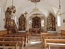 Das vierjochige Langhaus hat ein Stichkappengewölbe auf breiten Wandpfeilern mit Pilasterauflage auf hohen Sockeln. Die Flachbogenfenster sind mit Stuckrocaillen und Blumengirlanden geschmückt. Die Westempore steht auf zwei Säulen. Der eingezogene Chorbogen ist mit Voluten und C-Schnörkeln auf Wandpfeilern versehen und trägt im Scheitel eine stuckgerahmte Uhr. Der zweijochige Chor mit Dreiachtelschluss und einem Stichkappengewölbe hat Spitzbogenfenster und Wandpilaster mit Bandlwerkdekor in den vertieften Feldern.