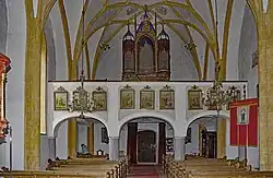 Innen trennt ein Triumphbogen Langhaus und Chor. Beide haben ein Netzrippengewölbe mit Stichkappen und Medaillons mit Heiligen-Darstellungen. An der Nordwand vor der Orgelempore zeigt ein restaurierter Freskenrest den segnenden Christus.