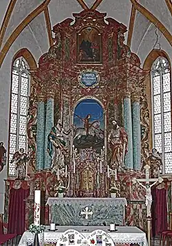 Der Hochaltar von 1720 ist ein barocker viersäuliger Ädikula-Altar mit Opfergangsportalen und Aufsatz. Im Schrein steht eine Schnitzfigur des hl. Georg zu Pferd als Drachentöter (um 1500). Diese Figur wird zeitweise gegen ein Gemälde mit der Darstellung der Taufe Jesu durch Johannes den Täufer ausgetauscht. Assistenzfiguren sind links der Apostel Petrus, rechts der Apostel Paulus. Im Aufsatz-Gemälde ist der hl. Benedikt dargestellt.