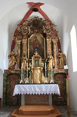 Der Hochaltar von 1768 mit Opfergangsportalen trägt ein Altarblatt aus dem 19. Jahrhundert mit der Wiedergabe heiligen Georg, flankiert von den barocken Statuen der heiligen Benedikt und Scholastika sowie der Apostelfürsten Petrus und Paulus.