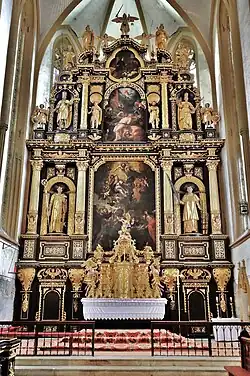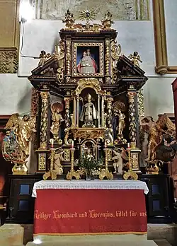 Der frühbarocke Hochaltar wurde um 1640 von Kaspar Alger aus Gmünd geschaffen und 1646 von Johann Seitlinger gefasst. Der dreigeschoßige Altar füllt den Chor nahezu in voller Höhe und Breite aus. Im hohen Sockelgeschoß steht auf der niedrigen Mensa ein goldgefasster Rokokotabernakel aus dem dritten Viertel des 18. Jahrhunderts. Seitlich befinden sich zwei rundbogige Opfergangsportale. Darüber schließt das Hauptgeschoß im Triumphbogentypus an. Das Mittelbild aus der ersten Hälfte des 18. Jahrhunderts zeigt die Himmelfahrt Mariens und wird von den Statuen der heiligen Leonhard und Laurentius flankiert. Im Obergeschoß stehen links die Skulpturen der heiligen Heinrich und Sebastian und rechts die von Kunigunde und Rochus. Das Aufsatzbild stellt die Marter des heiligen Laurentius dar. Die Bekrönung des Hochaltars bildet ein Tondo, den heiligen Leonhard bei den Gefangenen zeigend, und die Statuen von Michael, Katharina, Barbara, Georg und Florian.