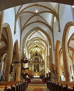 Im Inneren stellt sich die Kirche als dreischiffige Basilika bzw. Pseudobasilika (s. o.) mit gestaffelten Chören dar. Das Mittelschiff mit drei querrechteckigen Jochen ist kreuzrippengewölbt. Die über Spitzbögen aufsteigende Hochschiffswand des Mittelschiffes ruht abwechselnd auf Pfeilern und Säulen ohne Kapitelle. Das Turmjoch über der Westempore hat an den vier Seiten breite Spitzbögen. Die Empore wurde in der zweiten Hälfte des 16. Jahrhunderts in das Mittelschiff und das nördliche Seitenschiff eingebaut. Sie ist mit Tonnen mit Stichkappen unterwölbt. Der Emporenbrüstung ist eine pilasterartige Balustrade vorgeblendet. Darüber sind teilweise die gotischen spitzbogigen Scheidbögen sichtbar. Ein hoher profilierter Triumphbogen verbindet das Langhaus mit dem Chor. Der dreijochige Chor mit Fünfachtelschluss ist kreuzrippengewölbt, wobei das westliche, quadratische Joch von den anderen durch ein Gurtband getrennt wird. Das Chorgewölbe ruht auf Konsolen mit Weinlaubrelief und Absenkern[1], auf denen die vier Evangelistensymbole dargestellt sind. In der südlichen Chorwand ist eine Sitznische für zwei Zelebranten eingelassen, die von zwei Wimpergen mit Dreipassabschluss bekrönt wird. Daneben führt ein Portal mit eisenbeschlagener Tür in die einjochige Sakristei mit Fünfachtelschluss und einem Rosettenschlussstein im Kreuzrippengewölbe. Das Fresko mit dem Erzengel Michael als Seelenwäger an der Chornordwand wurde im frühen 15. Jahrhundert gemalt.