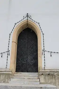 In den Kirchhof führt ein 1645 von Hans Schmitzberger errichtetes spätmanieristisches Friedhofsportal. Es ist um ein rundbogiges Quaderportal mit Volutenschlussstein, gesprengtem Giebel und drei Obelisken.
