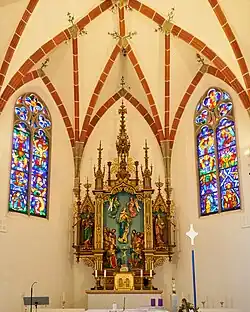 Der Bodenbelag der Kirche besteht seit der Innenrenovierung von 2019 aus Laaser Marmor. Im Zuge der Renovierung des Kircheninneren 2019, welche auch mit einer Neugestaltung des Altarraums verbunden war, schuf die Bildhauerin Gisela Stiegler eine neue Einrichtung (Volksaltar, Ambo, Leuchter, Session, Vortragekreuz, Kästchen für die heiligen Öle, Kredenztisch) sowie einen offenen Beichtstuhl in der Ölberg-Beichtkapelle.[5]
