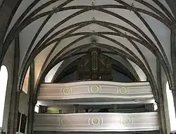 Das weitgespannte einschiffige vierjochige Langhaus mit einem halben östlichen und einem halben westlichen Joch hat ein Netzrippengewölbe. Der leicht eingezogene dreijochige netzrippengewölbte Chor mit einem Dreiachtelschluss hat reich abgetreppte Strebepfeiler. Die dreiachsige Westempore hat zwei Geschoße, das Untergeschoß netzrippenunterwölbt. Der gotische Westturm trägt einen barocken achtseitigen Aufsatz und einen Zwiebelhelm mit Laterne aus 1714. Die Sakristei hat ein Netzrippengewölbe und eine Tür mit gotischen Beschlägen.