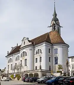 1762 vermerkte der Einsiedler Klosterbaumeister Kaspar Braun, dass die Kirche baufällig und zu klein sei. Den Neubau übernahmen Jakob Singer und sein jüngerer Bruder Johann Anton Singer, nachdem die Bauherrschaft 1763 mit ihnen einen Vertrag von 20'000 Gulden abgeschlossen hat.[4] Die neue Kirche, die von 1769 bis 1774 errichtet wurde, weist eine monumentale Fassade sowohl Richtung Hauptplatz wie am Hauptportal zur Herrengasse hin auf. Die Architektur gilt als spätbarock mit klassizistischen Elementen.[5]