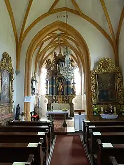 Das Kircheninnere zeigt ein zweijochiges Langhaus mit einem zarten spätgotischen Rippengewölbe mit Schlusssteinen aus dem Anfang des 16. Jahrhunderts. Die barocke Westempore steht auf toskanischen Säulen. Der zweijochige Chor mit einem Fünfachtelschluss hat ein Kreuzrippengewölbe auf Absenkern.