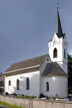 An das dreijochige Langhaus mit Flachtonne und Stichkappen schließt ein einjochiger, flach gewölbter Chor mit halbrunder Apsis. Der zweigeschoßige Turm mit spitzbogigen Schallfenstern im nördlichen Chorwinkel wird von einem Spitzgiebelhelm bekrönt. Westlich schließt eine rezente Aufbahrungshalle an. Im Langhaus und im Chor hat die Kirche Spitzbogenfenster. Der stark eingezogene und herabgezogene Triumphbogen hat einen Korbbogen mit breiter Laibung. Ein Portal mit geradem Sturz führt vom Chor in die kreuzgratgewölbte Sakristei im Turm. Das mit einem Holzbaldachin überdachte Westportal mit gedrücktem Bogen, verstärktem Kämpfer und Schlussstein ist mit 1862 bezeichnet. Im Giebelfeld darüber befindet sich ein Sternfenster. In der gemauerten Balustrade der Westempore, die auf zwei Pfeilern steht, ist eine spätbarocke Orgel. Die Wandmalereien stammen aus der Erbauungszeit (1862) und zeigen im Chor Gottvater, über dem Triumphbogen die Ölbergszene.