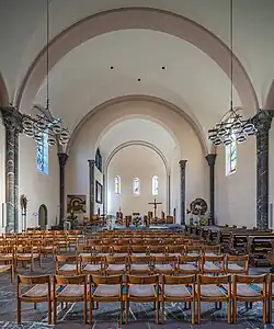 Im Zuge der Renovierungen in den 1970er und 1980er Jahren wurde ein grosser Teil der Innenausstattung verändert: Insbesondere durch die Entfernung der grossflächigen Wandmalereien, aber auch durch eine neue Deckengestaltung sowie durch den Ersatz der meisten Bänke durch Einzelstühle hat das Innere der Kirche ein wesentlich schlichteres Aussehen erhalten.[13] Ähnliches gilt für den vierbeinigen Altar aus Holz mit einer Mensa aus schwarzem Stein (Altarweihe am 8. Dezember 1982), dem Ambo aus grob bearbeitetem Stein und dem Zelebrantenstuhl aus Holz, welche für eine eher moderne Chorausstattung sorgen.[14]