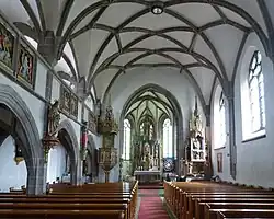 Das Langhaus hat drei östliche gotische Joche, zweischiffig mit einem breiten Hauptschiff und einem schmalen nördliche Seitenschiff, die zwei westlichen dreischiffigen Joche sind neugotisch, das südliche Seitenschiff springt querhausartig vorspringend. Die unterschiedlichen Seitenschiffe wurden mit dem Westjoch für den Einbau von Emporen genutzt, damit sind nur die vier östlichen Joche des Mittelschiffes als einheitlicher Kirchenraum (in der Art der Pfarrkirche Gramastetten) fassbar.