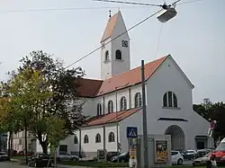 Die breite dreischiffige Pfeilerbasilika unter einem Satteldach mit einem Querhaus wurde von 1924 bis 1929 in romanischen Stil nach den Plänen des Baumeisters Matthäus Schlager erbaut. Der Platz vor der Eingangsfassade wurde mit Pater-Paulus-Platz benannt und für Paulus Wörndl als ersten Pfarrer der Kirche eine Gedenktafel an der Kirche angebracht.