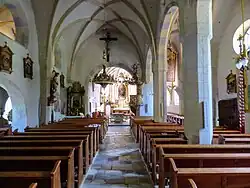 Die zweischiffige vierjochige Hallenkirche (Hauptschiff und Südschiff) hat ein Netzrippengewölbe mit Zweiparallelrippen auf Achteckpfeilern und ist zum Nordschiff den romanischen Breitwandpfeilern vorgelegt. Das niedrige dreieinhalbjochige Nordschiff mit Kreuzgratgewölben hat darüber eine kreuzrippengewölbte Empore, beide Geschoße sind zum Hauptschiff durch Arkaden geöffnet. Der zweijochige Chor mit einem Fünfachtelschluss und kreuzrippengewölbt ist gegenüber dem Hauptschiff etwas nach Süden verschoben und aus der Achse geknickt. Zwei Spitzbogenarkaden verbinden die südliche Kapelle mit dem Chor. Die Westempore auf einer Mittelsäule ist kreuzgratunterwölbt. Im Nordschiff gibt es einen Altarbaldachin auf einer romanischen Marmorsäule mit Kapitellen aus der zweiten Hälfte des 12. Jahrhunderts.