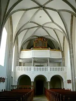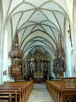 Der monumentale mittelalterliche Kirchenbau mit barockisierten Fassaden hat barocke Anbauten.