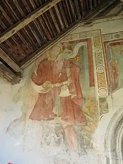 Die spätgotischen Malereien in den Gewölbekappen wurden 1970 freigelegt und zeigen den heiligen Petrus, die Muttergottes, Engel mit Leidenswerkzeugen sowie Blütenranken. Die in vier Streifen angeordneten Fresken an der Nordwand entstanden um 1370/1380 und wurden 1928 aufgedeckt. Dargestellt sind die Passion, Christus in der Mandorla, Maria, Engel und Apostel, darunter die Auferstehung der Seligen und der Zug zur Himmelsburg. Die dritte und vierte Reihe besteht aus Fragmenten der Dorotheenlegende. An der Südwand befinden sich Apostelkreuze.