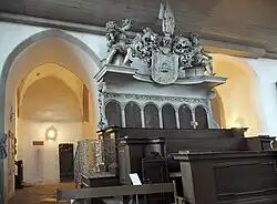 Das Hauptbild zeigt die Himmelfahrt Christi in Anlehnung an Raffaels Transfiguration, in der Predella ist die Grablegung Christi dargestellt. Das eiserne Altargitter stammt von 1698.