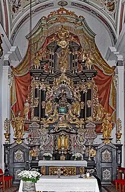 Der barocke Hochaltar (signiert 1668) ist ein viersäuliger Ädikula-Altar mit Aufsatz im gesprengten Giebel und Opfergangstüren. Im Schrein steht eine gekrönte Marienfigur mit gekröntem Jesuskind, im Aufsatz eine Figur des Auferstandenen. Bekrönt wird der Altar durch eine Halbfigur Gottvaters.