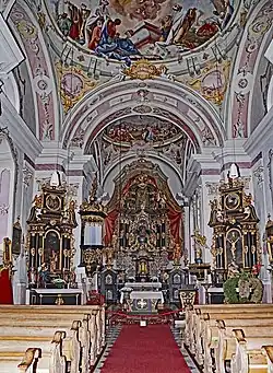 Das zentrale Deckengemälde im Langhaus stellt die Himmelfahrt Marias in einer Pseudokuppel dar. Das Gemälde im Gewölbe über der Orgel zeigt musizierende Engel.