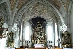 Das Kircheninnere zeigt ein dreijochiges Langhaus, das Gewölbe ist im Kern gotisch, die Wandpfeiler haben polygonale Dienste. Der weite Triumphbogen ist spitzbogig und abgekantet. Der einjochige Chor schließt mit einem Fünfachtelschluss, auch hier wurde das gotische Gewölbe in der Mitte des 18. Jahrhunderts verändert, die Rippen wurden abgeschlagen bzw. liegen unter Putz, das Gewölbe ruht auf flachen Wandpfeilern und Runddiensten. Im Turmerdgeschoß wurden beim ehemaligen spätgotischen Sternrippengewölbe ebenfalls die Rippen abgeschlagen.