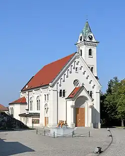 Die 1906/07 erbaute neoromanische Kirche besteht aus einem Langhaus mit eingezogenem polygonalem Chor und einem Nordturm. Die Fassade ist reich gegliedert. Die westliche Giebelfassade verfügt über ein Rundbogenfries und einen übergiebelten Portalvorbau mit Säulen, einer Fensterrosette und zwei Biforienfenstern darüber. Der schlanke, viergeschoßige Turm mit östlichem Treppenturm hat ein Rundbogenfries, rundbogige Schallfenster und ein Zeltdach hinter trapezförmigen Blendgiebeln. Südlich des Chores steht ein zweigeschoßiger Anbau.