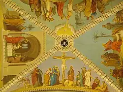 Die Glasmalereien am südlichen Langhaus schuf Max Spielmann 1946. Die Fresken im Langhaus schuf Georg Mader 1867/1871 mit Auferstehung Christi, Taufe Christi, Kreuzigung, Auferweckung der Tochter von Jairus, Bergpredigt und Geburt Christi. Die Fresken im Chor schuf Wolfram Köberl 1958, in der Chorkuppel Christkönig und an den Pendentifs als Ersatz für die 1853 verbrannten Seitenaltäre die Nothelferheiligen Pantaleon, Cyriakus, Vitus und Ägidius.