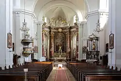 Der imposante, die gesamte Apsis einnehmender Hochaltar wurde nach einem Entwurf von Martin Keller von Franz Senger und Karl Müller ausgeführt. Das Hochaltarbild ist ein Werk aus dem Jahr 1777 von Johann Meidinger (1733–1806) und stellt das Martyrium des hl. Stephanus dar.