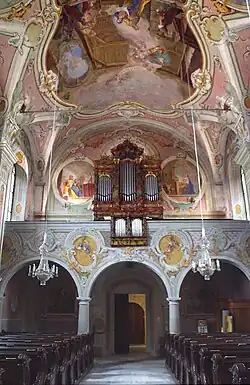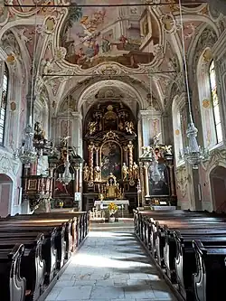 Das Kircheninnere zeigt ein frühbarockes vierjochiges rechteckiges Langhaus unter einem Stichkappengewölbe auf Wandvorlagen. Der Orgelchor ist dreiachsig.