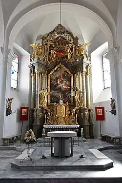 Das zweijochige Langhaus ist mit einem Platzlgewölbe auf einschwingenden Wandpfeilern überwölbt. Der eingezogene einjochige Chor hat einen Halbkreisschluss. Nordseitig ist eine quadratische Kapelle angebaut, südseitig eine Sakristei mit Oratorium. Die Westempore hat eine vorgewölbte Brüstung, während die Einturmfassade im Westen einen leicht vortretenden Mittelteil und eine Pilastergliederung aufweist.