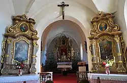 Das Kircheninnere zeigt ein zweijochiges Langhaus mit einem Kreuzrippengewölbe auf Konsolen aus Stuck. Die Holzempore steht im engen Turmerdgeschoß.