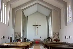 Der massiv wirkende Kirchenbau mit einem durch Betonstützen gegliederten Langhaus hat einen eingezogenen flachbogig geschlossenen Chor. Zwischen den Betonstützen sind schmale hohe Rechteckfenster. Der hohe Kirchturm verjüngt sich nach oben und schließt oben waagrecht ab. Die östliche Giebelfront hat ein breites Rechteckportal flankiert von rechteckigen ornamentalen Glasfenstern, über dem Portal ist ein weites Glasbetonrundfenster Herz Jesu.[1]