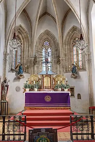 Der Hochaltar ist ein freistehender Altar mit spätromanischer Mensa aus dem 12. Jahrhundert in neugotischer Verkleidung. Der Tabernakel aus der ersten Hälfte des 19. Jahrhunderts wurde mit seitlichen barocken Reliefs der Heiligen Petrus und Maria versehen. Diese Reliefs stammen von den ursprünglichen Beichtstühlen aus dem zweiten Viertel des 18. Jahrhunderts. Das barocke Holzkruzifix wurde in der ersten Hälfte des 18. Jahrhunderts geschaffen. Darüber ist eine freischwebende Madonnenfigur aus der Zeit um 1330. Diese besteht aus polychromiertem Lindenholz. Der Strahlenkranz rund um die Figur wurde 1845 hinzugefügt. Seitlich sind hölzerne Leuchterengel aus der Mitte des 19. Jahrhunderts.