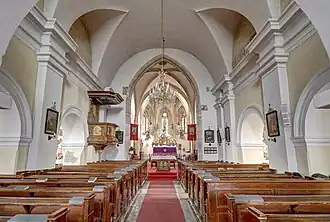 Die Kirche hat ein dreischiffiges, im Kern gotisches Langhaus aus dem 13. und 14. Jahrhundert. Das Mittelschiff ist vermutlich der Rest des romanischen Saalbaues. Das Mittelschiff ist dreijochig, darüber ist ein barockes Stichkappentonnengewölbe, das auf Wandvorlagen und einem umlaufenden gekröpften Gebälk aus der Zeit um 1670 ruht. Auf der Westseite ist eine dreiachsige Orgelempore die kreuzgratunterwölbt ist und auf Säulen ruht. Das Mittelschiff ist zu den Seitenschiffen hin in Rundbogenarkaden geöffnet, die auf schweren Pfeilern ruht, die um 1670 ummantelt wurden. Im westlichen Joch ist eine abgefaste Spitzbogenarkade. Die Seitenschiffe wurden im 17. Jahrhundert kreuzgratgewölbt. Der spätgotische Triumphbogen der das Langhaus vom Chor trennt, ist eingezogen und besteht aus abgefastem Bruchsteinmauerwerk mit doppelter Kehlung. Der gotische Chor ist etwas erhöht und einjochig. Das quadratische Chorjoch könnte das romanische Chorquadrat gewesen sein. Der Chor endet im 5/8-Schluss. Darüber ist Kreuzrippengewölbe mit kleinen rosettenförmigen Schlusssteinen. Die birnstabförmigen Rippen werden in Dienstbündel mit profilierten Kapitellen und Schaftringen zusammengefasst. Die Wandgliederung ist in Verbindung mit der zweifach gekehlten Umrahmung der gotischen Maßwerkfenster sehr dicht. In der Südwand des Chores ist eine zweiteilige Session mit Dreipassmaßwerk. Die rechteckige Sakramentsnische stammt aus dem 16. Jahrhundert. In einer kleinen Rundbogennische im Altarraum ist ein Rundstein, ein ehemaliger Schussstein der romanischen Kirche, eingemauert. Auf ihm ist ein Greif und ein Wurm dargestellt. Die Seitenkapelle nördlich des Langhauses ist korbbogengewölbt. Dazwischen sind Gurtbögen. Die Sakristei ist im Kern frühgotisch und wurde 1845 flachgedeckt.